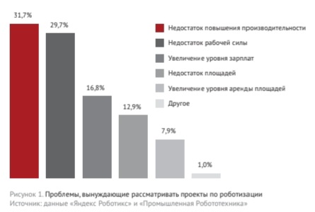 Бизнесу уже давно не нужно объяснять, как автоматизация и цифровизация влияют на результаты работы. В последние годы компании вынуждены были оперативно реагировать на ускорение инфляции, рост себе стоимости доставки товаров, падение прибыли, дефицит кадров, изменение транспортных коридоров. Исследование «Яндекс Роботикс» доказало, что роботизация, по мнению опрошенных, способна повысить производительность труда и решить проблему с нехваткой людей. Более того, техника позволяет снять с сотрудников тяжелые физические нагрузки и перенаправить ресурсы на решение более сложных задач. Около трети экспертов отметили, что именно эти факты мотивируют их компании развивать проекты в этой сфере (рис. 1).