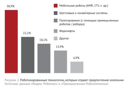 Специалисты считают, что будущее за мобильными роботами AMR1*, CTU2** и др. По крайней мере, в настоящее время почти 40% компаний выбирают подобные решения (рис. 2).