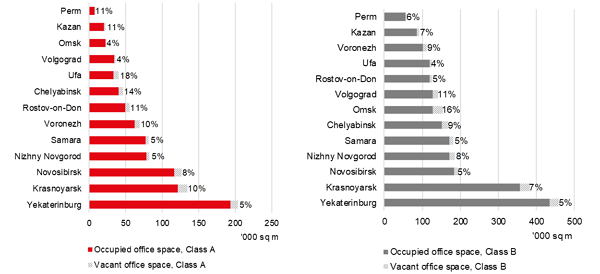 Within the regional millionniki cities, the average vacancy rate in Class A is 9%, in Class B 7% which is almost half of the vacancy rate in Moscow (16.7% and 15.6% accordingly).