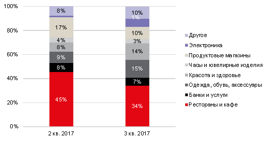 В структуре спроса в 3-м квартале традиционно лидировали кафе и рестораны с долей 34% в объеме заявок. При этом на 2-е место вернулись fashion операторы: в общем числе заявок их доля выросла с 9% кварталом ранее до 15% в конце сентября 2017 года. В остальных группах арендаторов произошло незначительное восстановление активности.