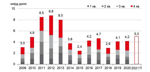 Динамика объема инвестиционных сделок на рынке недвижимости России, млрд долл.*