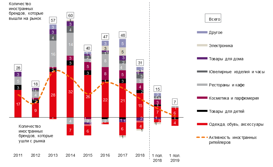 Кроме того, пять брендов покинули российский рынок в 1-й половине 2019 года против четырех за аналогичный период предыдущего года.