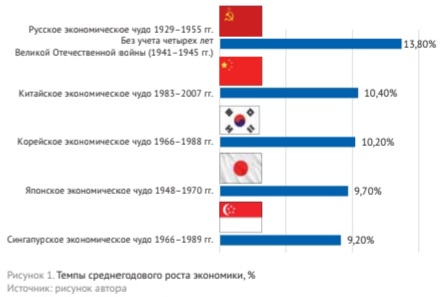 Наша страна установила мировой рекорд XX в. по темпам экономического роста. В течение 26 лет (без учета четырех военных лет) среднегодовой рост отечественной экономики составлял 13,8% – результат, который до сих пор не превзошла ни одна страна мира (рис. 1).
