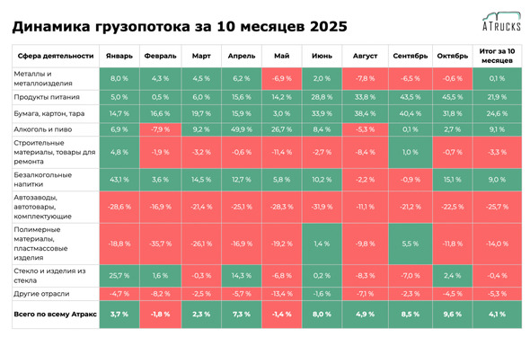 Логистическая площадка «Атракс» подвела итоги десяти месяцев 2025 года. Октябрь показал один из наиболее высоких темпов роста с весны, что закрепило сложившуюся отраслевую динамику: на фоне устойчивого потребительского спроса в ряде промышленных сегментов сохраняется снижение.