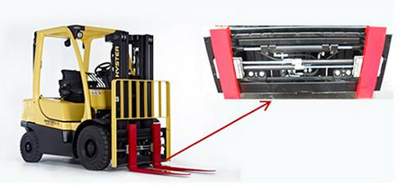Основным преимуществом каретки с боковым смещением и позиционером является то, что она позволяет регулировать расстояние между вилами и их положение относительно центра погрузчика одновременно.