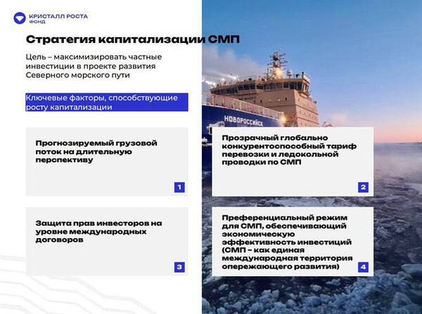 По итогам предметного обсуждения данной задачи на заседании Морской коллегии, её Председатель, постоянный член Совбеза РФ Николай Патрушев официально утвердил решения, в соотвествии с которыми Фонду «Кристалл роста» совместно с Госкорпорациями «ВЭБ.РФ» и «Росатом» поручено разработать комплексный проект, обеспечивающий защиту национальных интересов России в Арктики и раскрытие её богатого социально-экономического и транзитного потенциала.