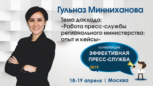 С таким докладом выступит пресс-секретарь министерства строительства, архитектуры и ЖКХ Республики Татарстан Гульназ Минниханова на ежегодной международной практической конференции «ЭФФЕКТИВНАЯ ПРЕСС-СЛУЖБА-2019», которая состоится в Москве 18-19 апреля.