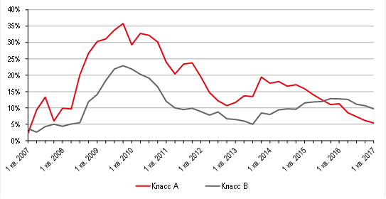 Доля вакантных офисных площадей в Санкт-Петербурге по классам