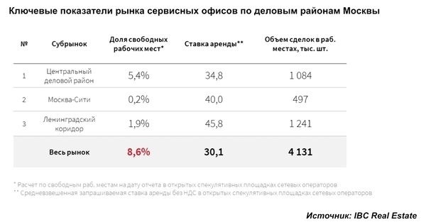 Наиболее востребованным субрынком для аренды сервисных офисов является Ленинградский деловой коридор – 1,2 тыс. раб. мест или 30% от общего объема сделок, а также Центральный деловой район – 1,1 тыс. раб. мест или 26% от суммарного объема арендованных рабочих мест в сервисных офисах Москвы.