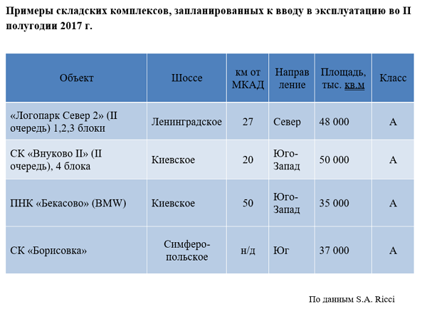 По данный S.A. Ricci, в I полугодии 2017 г. на рынок складской недвижимости Московского региона вышло около 130 тыс. кв. м новых качественных площадей, что на 32% (112 тыс. кв.м) больше по сравнению с аналогичным периодом 2016 года, однако, тем не менее, является одним из самых низких показателей за последние 10 лет. Для сравнения: первые шесть месяцев 2014 и 2015 г. были рекордными: тогда показатели ввода нового предложения составили 672 тыс. кв. м и 567 тыс. кв. м.