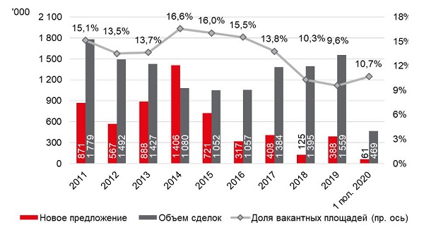 Карантинные меры и приостановление строительства отразились и на вводе новых офисных объектов. По итогам 1-го полугодия новое предложение в Москве составило 61 тыс. кв. м, что в 2 раза ниже и так невысокого значения аналогичного периода прошлого года (120 тыс. кв. м). Во 2-м квартале было введено только два объекта класса В+, совокупной площадью 5 тыс. кв. м. Несмотря на высокую степень готовности ряда объектов, ввод в эксплуатацию практически всех бизнес-центров, изначально намеченный на прошедший квартал, был перенесен на 3-4 квартал. Это обусловлено карантинным периодом, который повлек за собой как приостановку строительных работ, так и переход на удаленный режим работы контролирующих организаций. Учитывая то, что тенденция к переносу сроков окончания строительства сохранится и во второй половине года, мы ожидаем, что объем нового предложения по итогам 2020 года составит порядка 350 тыс. кв. м.