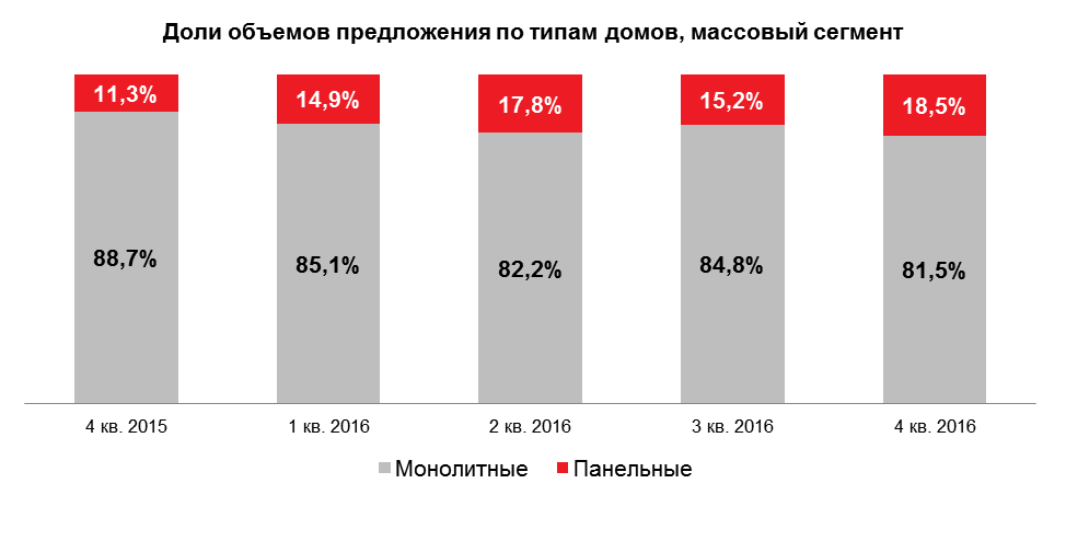 В среднем доля предложения в панельных домах в массовом сегменте в 2016 году была на уровне 15%. В годовой динамике она выросла с 11,3% до 18,5%.