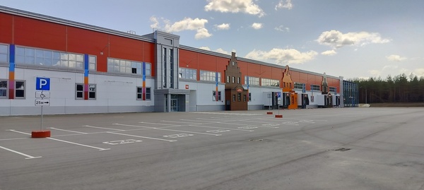 Новый распределительный центр обслуживает 18 магазинов по всей Нижегородской области. Расположенный около выезда на федеральную трассу М-7 он сразу привлекает взгляд: вместо типовой серой коробки водителей большегрузов встречает яркий фасад. Здесь на площади около 21 тыс. м2 организовано хранение продукции, комплектование, распределение и транспортировка грузов, есть площадка для уличного хранения стройматериалов.